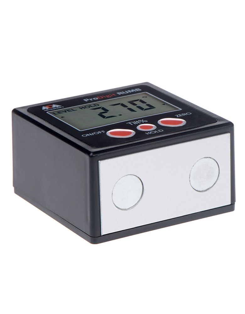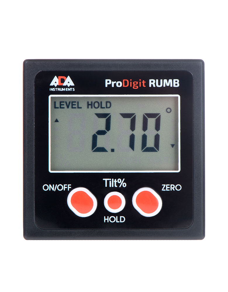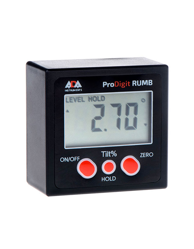 ADA PRO Digit RUMB è un livello elettronico digitale progettato per la determinazione accurata della deflessione angolare della superficie orizzontale o verticale. Appoggiandolo sulla superficie desiderata è possibile visualizzare la deflessione angolare e la sua direzione. Inoltre ha una modalità speciale per misurare i relativi angoli. Il piano di lavoro è dotato di magneti per il montaggio su strutture in acciaio.